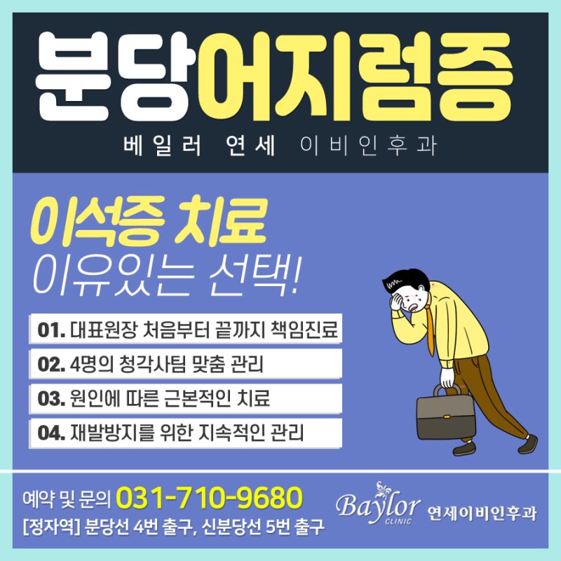 현기증이 나는 자세는 이석이 어느 반고리관에 들어가느냐에 따라 달라집니다. 후반의 윤관에 이석하는 경우는 자려고 뒤로 젖히거나 잠자리에서 일어날 때 고개를 들거나 고개를 숙이면 현기증을 느낍니다.측반환관에 이석이 들어가게 되면 주로 잠자리에서 뒤척일 때 어지럼증이 발생하기 때문에 이석증은 누워서 일어날 때뿐만 아니라 서 있을 때나 앉아 있을 때에도 모두 발생할 수 있습니다.현기증이 나는 자세는 이석이 어느 반고리관에 들어가느냐에 따라 달라집니다. 후반의 윤관에 이석하는 경우는 자려고 뒤로 젖히거나 잠자리에서 일어날 때 고개를 들거나 고개를 숙이면 현기증을 느낍니다.측반환관에 이석이 들어가게 되면 주로 잠자리에서 뒤척일 때 어지럼증이 발생하기 때문에 이석증은 누워서 일어날 때뿐만 아니라 서 있을 때나 앉아 있을 때에도 모두 발생할 수 있습니다.발병 원인은?이석증이 발생하는 원인은 아직 명확하게 알려져 있는 것은 아닙니다. 다만 지금까지 알려진 원인으로는 머리에 심한 충격을 받는 외상, 장시간 누워 있는 자세, 귓속 염증 등이 있습니다. 특히 머리에 외상이 있는 경우 이석기관에서 이석이 떨어져 반환관으로 들어가기도 합니다. 또한 병원에서 장기간 입원하여 누워 있는 경우에도 이석증이 발생하기 쉽습니다.그 밖에도 고혈압이나 당뇨, 고지혈증, 갑상선 질환과도 이석증이 약간 관계가 있다고 합니다. 그러나 대부분의 발병은 원인불명인 경우가 가장 많습니다. 한편 비타민D 수치 저하와도 관계가 있는데 스트레스나 불안 상태에서도 이석증 발병 빈도가 증가한다고 합니다.이석증이 발생하는 원인은 아직 명확하게 알려져 있는 것은 아닙니다. 다만 지금까지 알려진 원인으로는 머리에 심한 충격을 받는 외상, 장시간 누워 있는 자세, 귓속 염증 등이 있습니다. 특히 머리에 외상이 있는 경우 이석기관에서 이석이 떨어져 반환관으로 들어가기도 합니다. 또한 병원에서 장기간 입원하여 누워 있는 경우에도 이석증이 발생하기 쉽습니다.그 밖에도 고혈압이나 당뇨, 고지혈증, 갑상선 질환과도 이석증이 약간 관계가 있다고 합니다. 그러나 대부분의 발병은 원인불명인 경우가 가장 많습니다. 한편 비타민D 수치 저하와도 관계가 있는데 스트레스나 불안 상태에서도 이석증 발병 빈도가 증가한다고 합니다.이석증이 발생하는 원인은 아직 명확하게 알려져 있는 것은 아닙니다. 다만 지금까지 알려진 원인으로는 머리에 심한 충격을 받는 외상, 장시간 누워 있는 자세, 귓속 염증 등이 있습니다. 특히 머리에 외상이 있는 경우 이석기관에서 이석이 떨어져 반환관으로 들어가기도 합니다. 또한 병원에서 장기간 입원하여 누워 있는 경우에도 이석증이 발생하기 쉽습니다.그 밖에도 고혈압이나 당뇨, 고지혈증, 갑상선 질환과도 이석증이 약간 관계가 있다고 합니다. 그러나 대부분의 발병은 원인불명인 경우가 가장 많습니다. 한편 비타민D 수치 저하와도 관계가 있는데 스트레스나 불안 상태에서도 이석증 발병 빈도가 증가한다고 합니다.치료하려면?이석증은 물리적으로는 치료가 쉬운 편입니다. 반환관에 들어간 이석증을 제자리인 이석기관에 넣으면 돼요. 따라서 치료의 첫 번째 단계는 이석이 어느 부분의 반환관에 들어 있는지 확인합니다. 반환관은 귓속에 전반환관, 후반이관, 수평반환관이 있어 정밀검사로 이석이 어느 부위에 들어 있는지 확인하는 것이 치료 절차입니다.이후 환자의 상태에 맞는 이석교정술을 시행합니다. 후반에 윤관에 들어가면 침대에 앉은 상태에서 고개를 오른쪽으로 돌려 누운 다음 목 반대 방향을 돌리는 앱 이석교정술을 시행합니다. 쉽게 치료되는 경우는 한 번의 치료법만으로 진행하며 시간은 5분 내외로 짧습니다.하지만 가끔은 치료가 어려운 이석도 있습니다. 특히 수평 반환관에 붙어 있는 이석증이라면 시간이 오래 걸리고 환자도 집에서 이석 자가재활운동을 해야 할 수도 있습니다. 그 후 남아있는 어지럼증은 약물치료를 함께 합니다.이석증은 물리적으로는 치료가 쉬운 편입니다. 반환관에 들어간 이석증을 제자리인 이석기관에 넣으면 돼요. 따라서 치료의 첫 번째 단계는 이석이 어느 부분의 반환관에 들어 있는지 확인합니다. 반환관은 귓속에 전반환관, 후반이관, 수평반환관이 있어 정밀검사로 이석이 어느 부위에 들어 있는지 확인하는 것이 치료 절차입니다.이후 환자의 상태에 맞는 이석교정술을 시행합니다. 후반에 윤관에 들어가면 침대에 앉은 상태에서 고개를 오른쪽으로 돌려 누운 다음 목 반대 방향을 돌리는 앱 이석교정술을 시행합니다. 쉽게 치료되는 경우는 한 번의 치료법만으로 진행하며 시간은 5분 내외로 짧습니다.하지만 가끔은 치료가 어려운 이석도 있습니다. 특히 수평 반환관에 붙어 있는 이석증이라면 시간이 오래 걸리고 환자도 집에서 이석 자가재활운동을 해야 할 수도 있습니다. 그 후 남아있는 어지럼증은 약물치료를 함께 합니다.이석증은 물리적으로는 치료가 쉬운 편입니다. 반환관에 들어간 이석증을 제자리인 이석기관에 넣으면 돼요. 따라서 치료의 첫 번째 단계는 이석