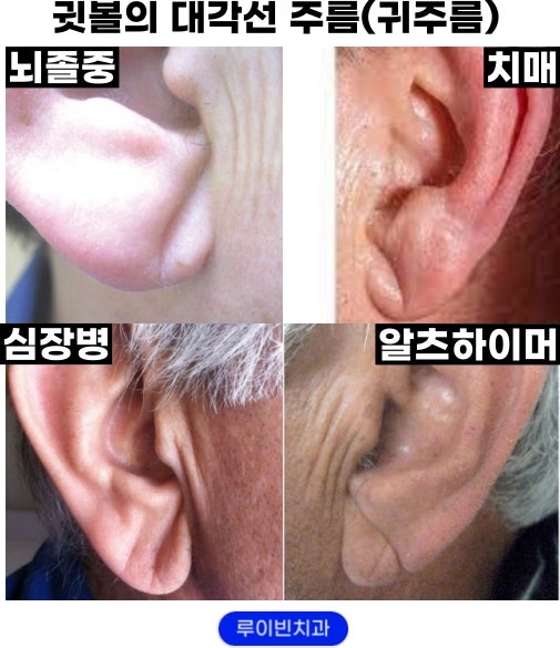 귀 염증이 없는 이명, 청력 상실, 한쪽 눈꺼풀 처짐, 안면 충혈 및 종종 안면 부종 외에도 귓불 주름은 치매(뇌졸중) 및 심혈관 및 뇌혈관 질환의 잘 알려진 위험 징후입니다. Frank’s Sign이라고 하는데, 급성 뇌졸중 환자의 78%가 귓불에 눈에 띄는 사선을 가지고 있다는 의학 논문을 통해 알려졌습니다. 턱신경통병원 루이빈치과의원