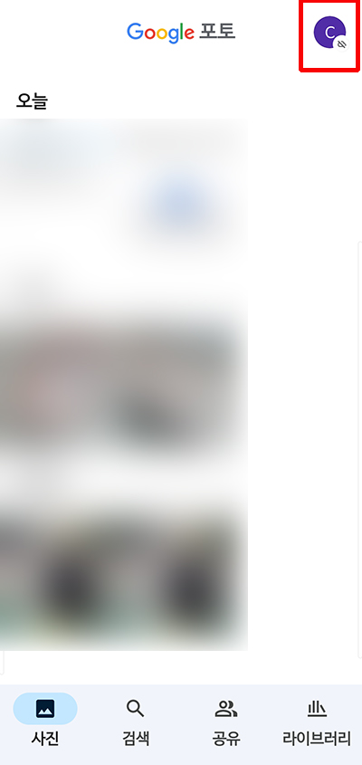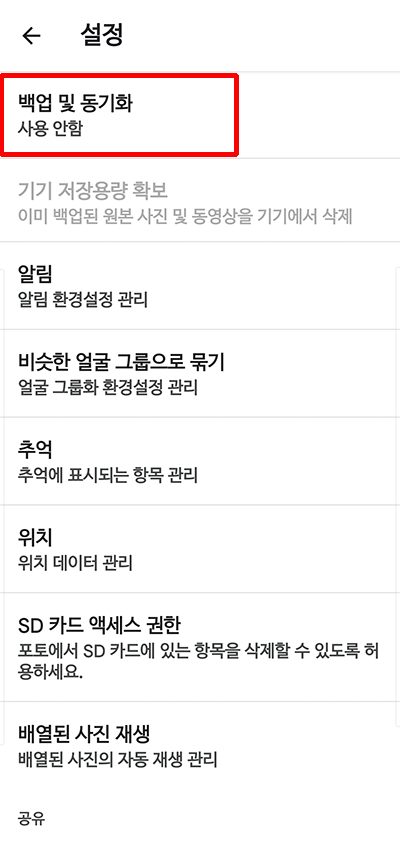 Google 포토 백업 및 동기화 기능을 사용하지 않으려면 사진 설정 메뉴로 이동하여 상단의 백업 및 동기화 항목을 선택하여 끕니다.
