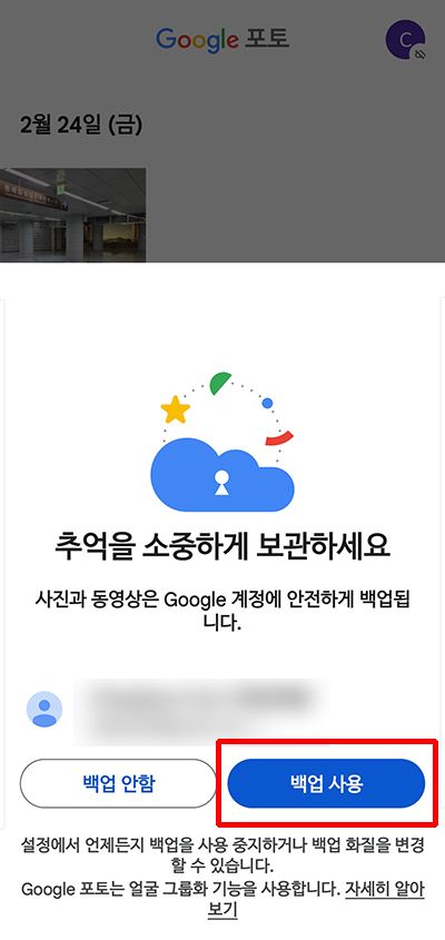 구글 포토를 처음 사용하는 경우 구글 계정에 로그인한 상태에서 구글 포토 앱을 실행하면 첫 화면에서 백업을 사용할 것인지 묻습니다. 여기에서 이 작업을 수행할지 여부를 선택할 수 있습니다.
