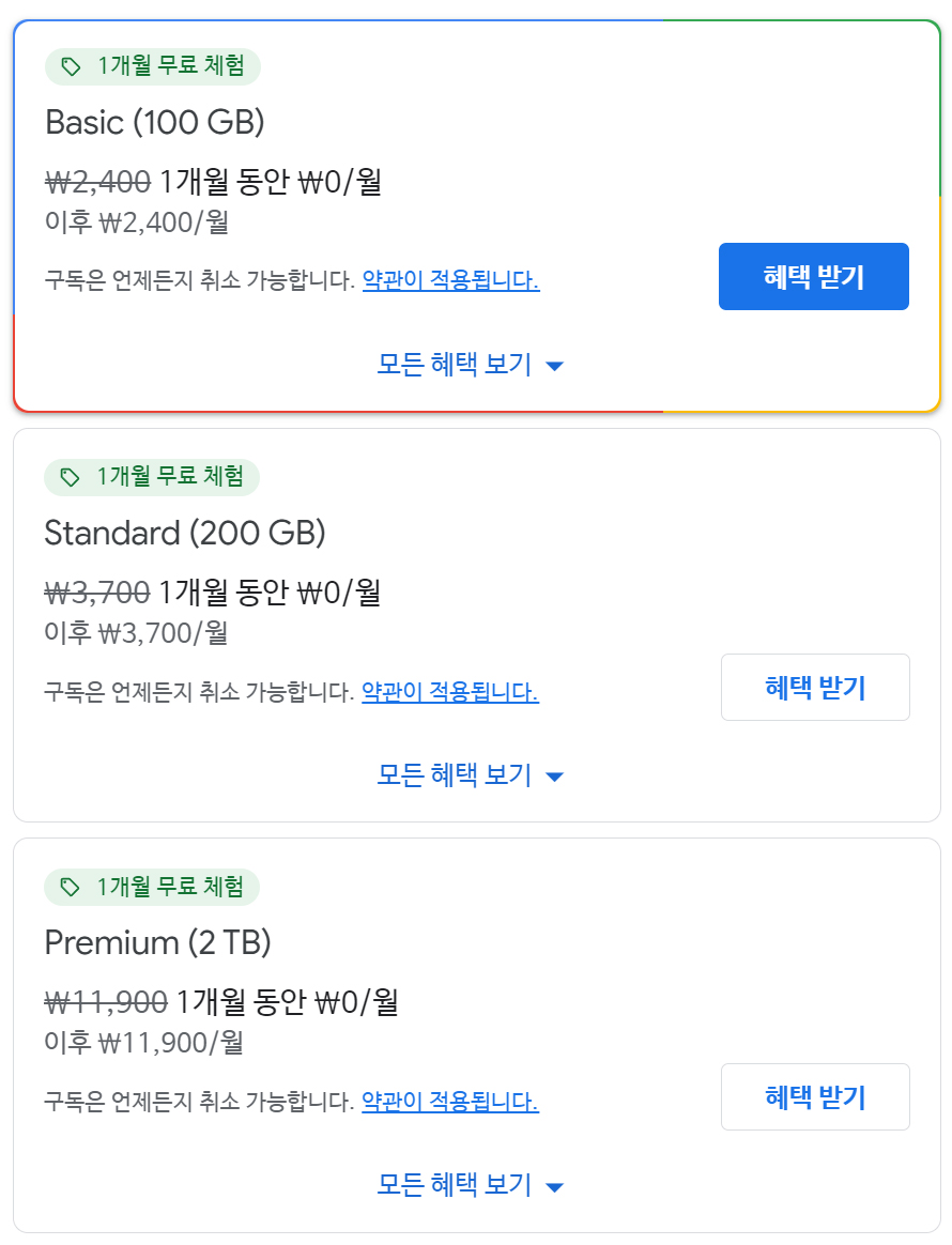 구글 포토 백업 및 동기화 기능이 마음에 들고 본격적으로 용량을 늘려서 활용하고 싶다면 용량당 1개월씩 무료로 사용해 볼 수 있다. 100GB의 대부분은 무료 체험판으로 사용할 수 있지만, 1개월 이후에 별도로 구독을 해지하지 않으면 1개월 이후에는 월 2,400원씩 요금이 청구됩니다.