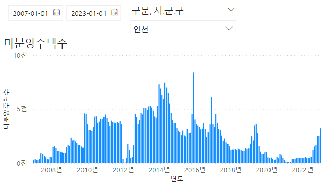 인천 2023년 1월 미분양은 3,209채로 2022년 12월 2,494채보다 28.6% 증가했다.했다. 2022년 1월 미분양(423세대)과 비교하면 약 7배 늘었다. 구분별 미분양 주택 현황은 계양구 246건, 남구 404건, 남동구 458건이다.