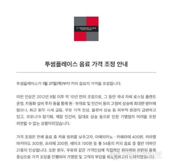 대표 메뉴였던 아메리카노가 1월 13일부터 4,500원→4,100원으로 오른다고 합니다.