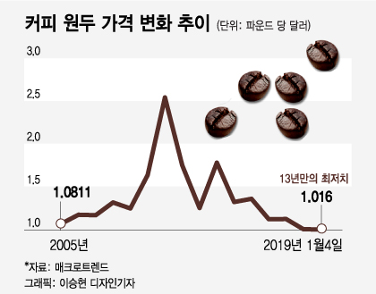 기후변화로 커피 생산량도 감소해 아라비 카로스테드 빈 선물이 약 450g당 2.5달러에 거래돼 10년 만에 최고치를 기록했다고 합니다.