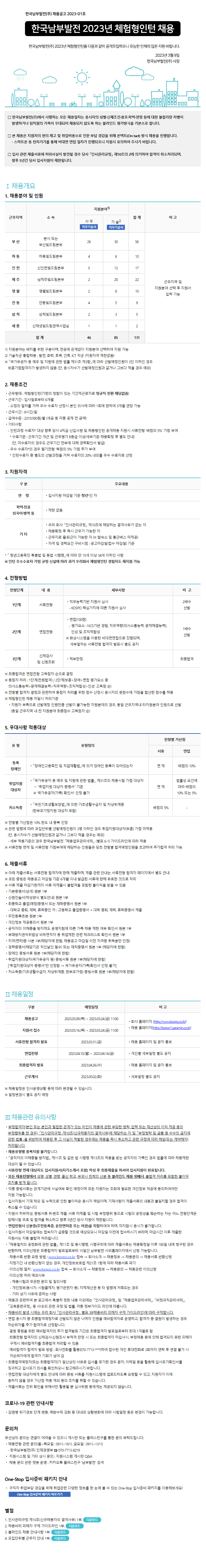 1) 채용일정 2) 선발방법 남부전력 경력인턴의 경우 서류전형→면접전형의 2단계로 타 공공기관과 동일하나 자세한 사항은 아래를 참고하시기 바랍니다. 3) 우대신청 양식은 다음과 같습니다. 2023년도 대한민국 전력경력인턴 채용공고를 공고하며, 채용공고 첨부파일은 아래와 같습니다. 첨부파일 한국남전 2023년 경력인턴 채용 공고.pdf 파일 다운로드 첨부파일 채용공고_경력인턴.zip 파일 다운로드 첨부파일 채용지원서_경력인턴_채용검색.pdf 파일 다운로드 이에 대한 기타 문의사항은 아래 댓글로 남겨주세요. , 아는 대로 답장 드리겠습니다. “이웃추가”를 클릭하시면, 작업튜터가 등록한 글을 가장 빠르게 받아보실 수 있습니다. 이 글이 도움이 되셨다면 좋아요와 댓글 부탁드립니다.