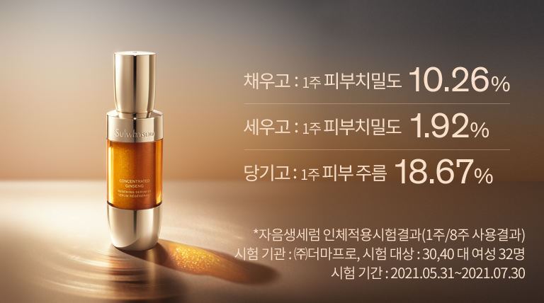 자음생에센스 인체적용시험결과 7일 사용만으로 충전, 발기, 리프팅 3중 탄력효과 확인 시험결과(1주 사용결과) 시험기관: (주)더마프로 / 시험대상자: 여성 32명 만 30~40세 / 시험기간 : 2021.05.31 ~ 2021.07.30